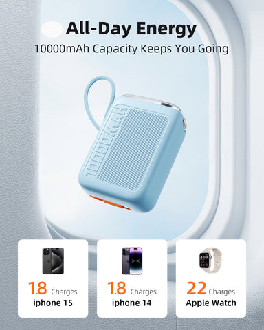 High - Capacity 10,000mAh Battery: With a 10,000mAh capacity, this power bank can charge your iPhone 16 up to 2.5 times, Samsung Galaxy S24 around 1.8 times, and most Android devices multiple times. Keep your devices powered throughout the day.